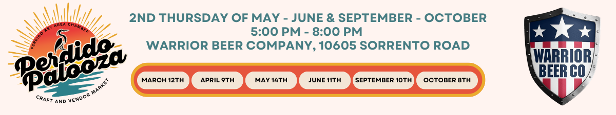 Perdido Palooza is a vibrant monthly community party that brings people together in a fun, festive atmosphere! Hosted by the Perdido Key Area Chamber of Commerce and Warrior Beer Company, this event is designed to celebrate the spirit and charm of the Perdido community! Held from May through October, each month features live performances from talented musicians, craft beer, local food trucks, and a strong focus on supporting the community through partnerships with local businesses and artisans.